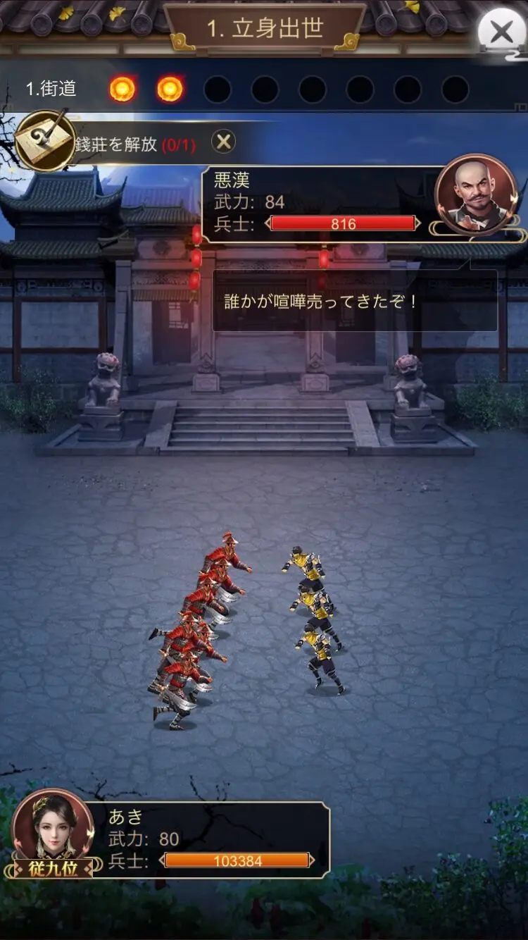 戦闘はターン制の自動進行型で、門客を配置して挑むシステム。